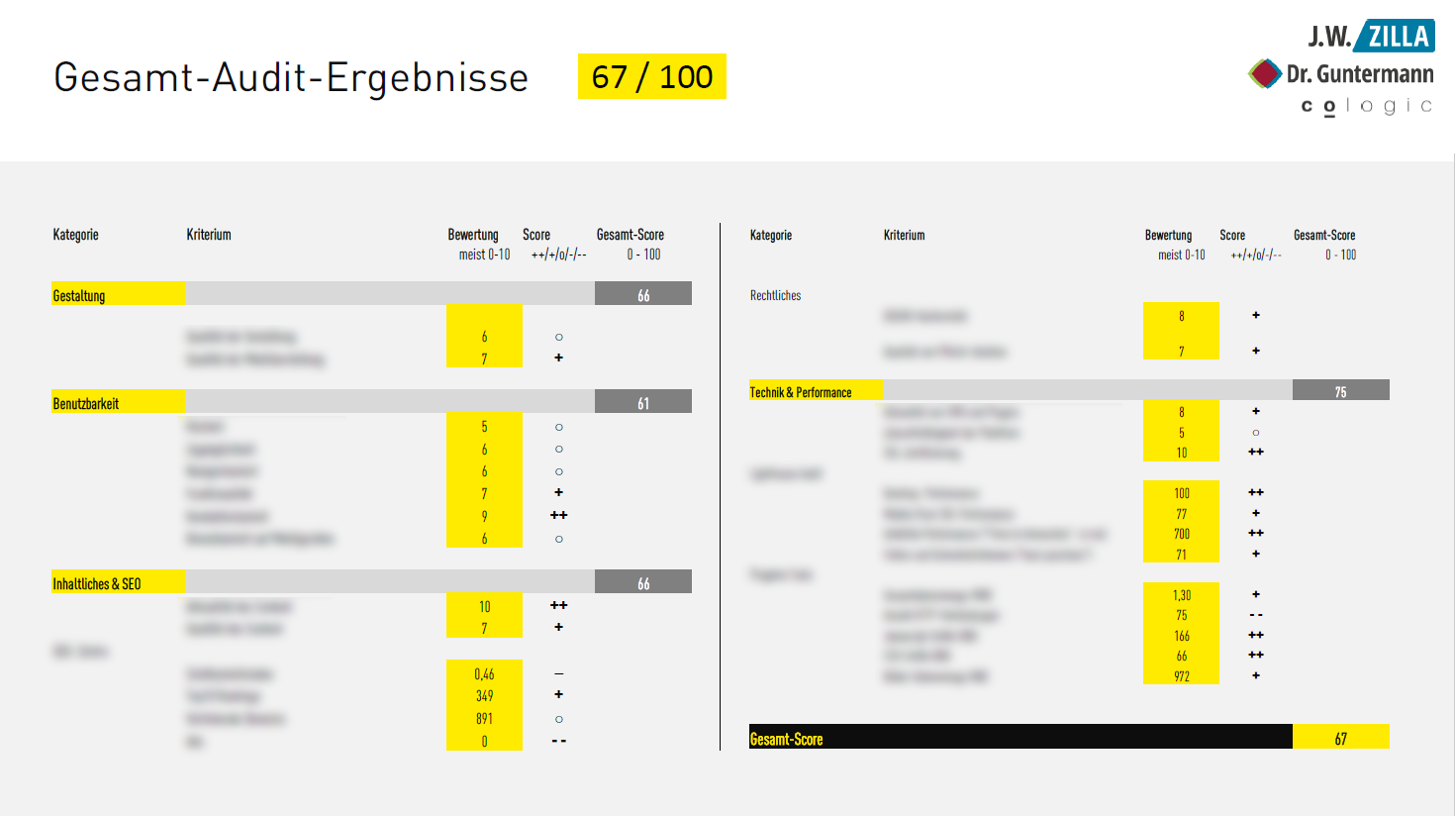 Die so erstellte Bewertung der Webseite durch unsere Web-Experten und unsere Partner-Agenturen von Dr. Guntermann und Zilla hilft, Schwachstellen und Stärken zu identifizieren und bildet so ein wertvolles Instrument bei strategischen Überlegungen und konkreten Planungsschritten für eine Adaption der Webseite. Gerade für Fälle, in denen einzelnen Bereiche gut, andere schlecht abschneiden, wird so eine konkrete Handlungsoption aufgezeigt, um eine aufwendige Komplett-Überholung der gesamten Webseite zu vermeiden und stattdessen ausgewählte Aspekte zu behandeln. In anderen Fällen hingegen ergeben sich Hinweise, wie die Prozessschritte eines Relaunches priorisiert oder ein starker Fokus auf Traffic-bringende Maßnahmen gelegt werden können.
