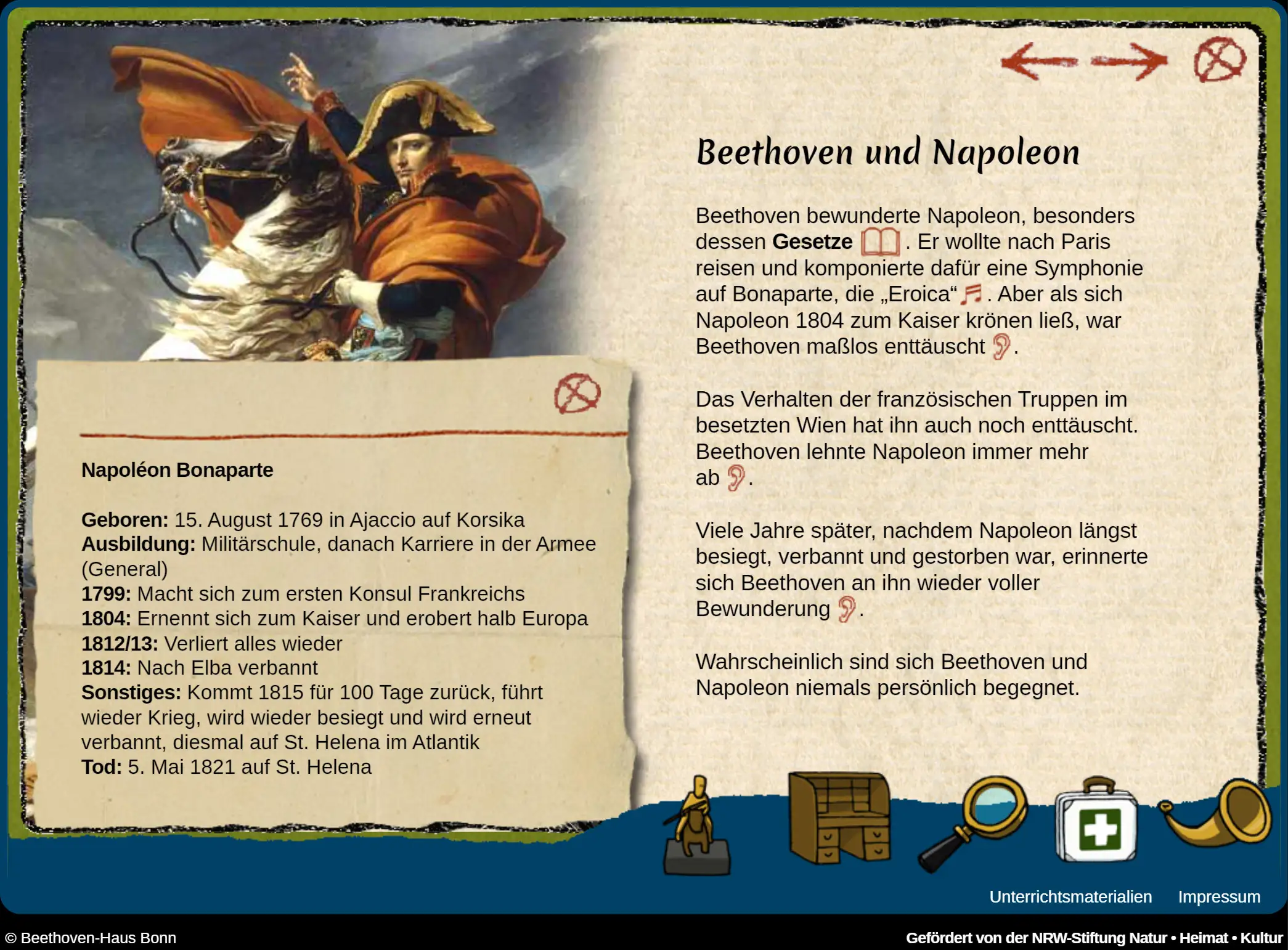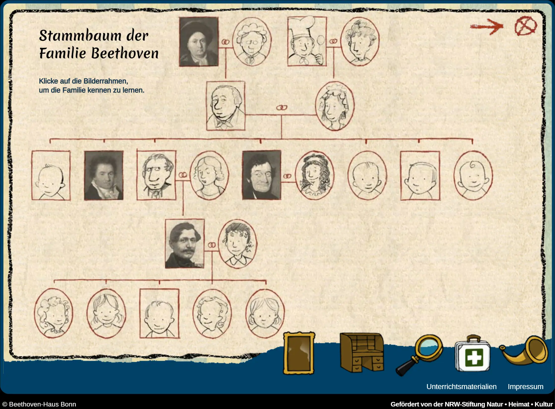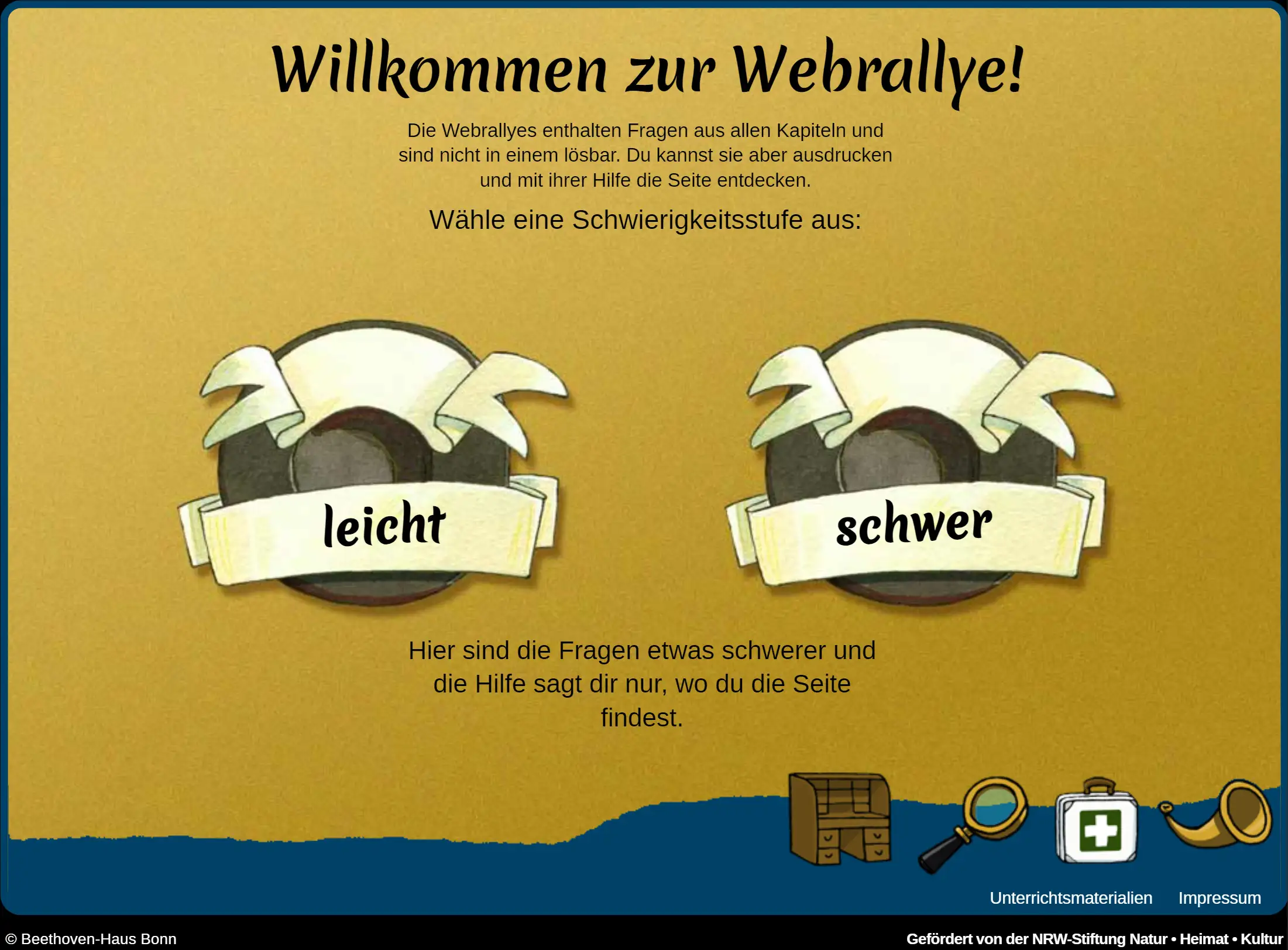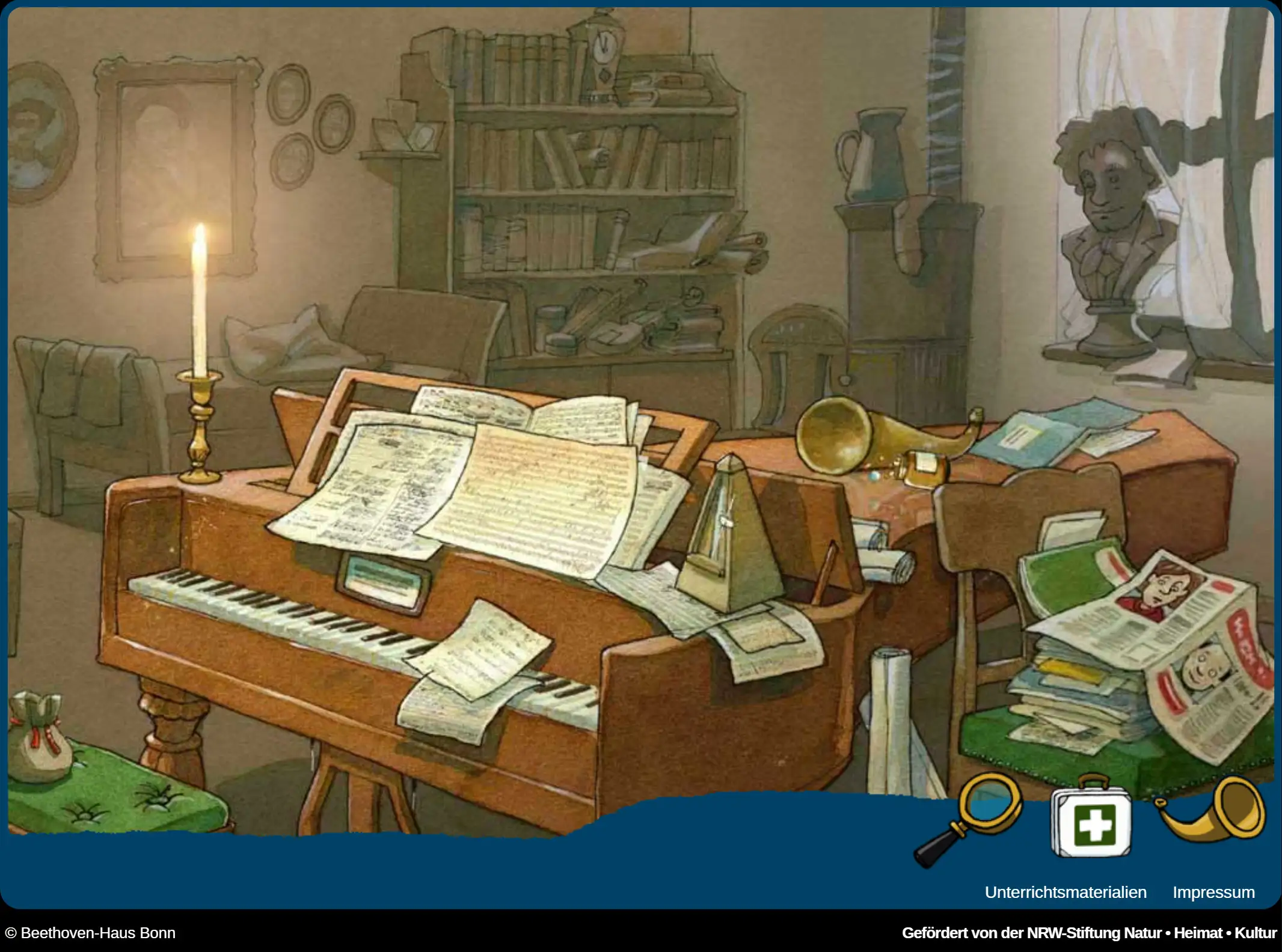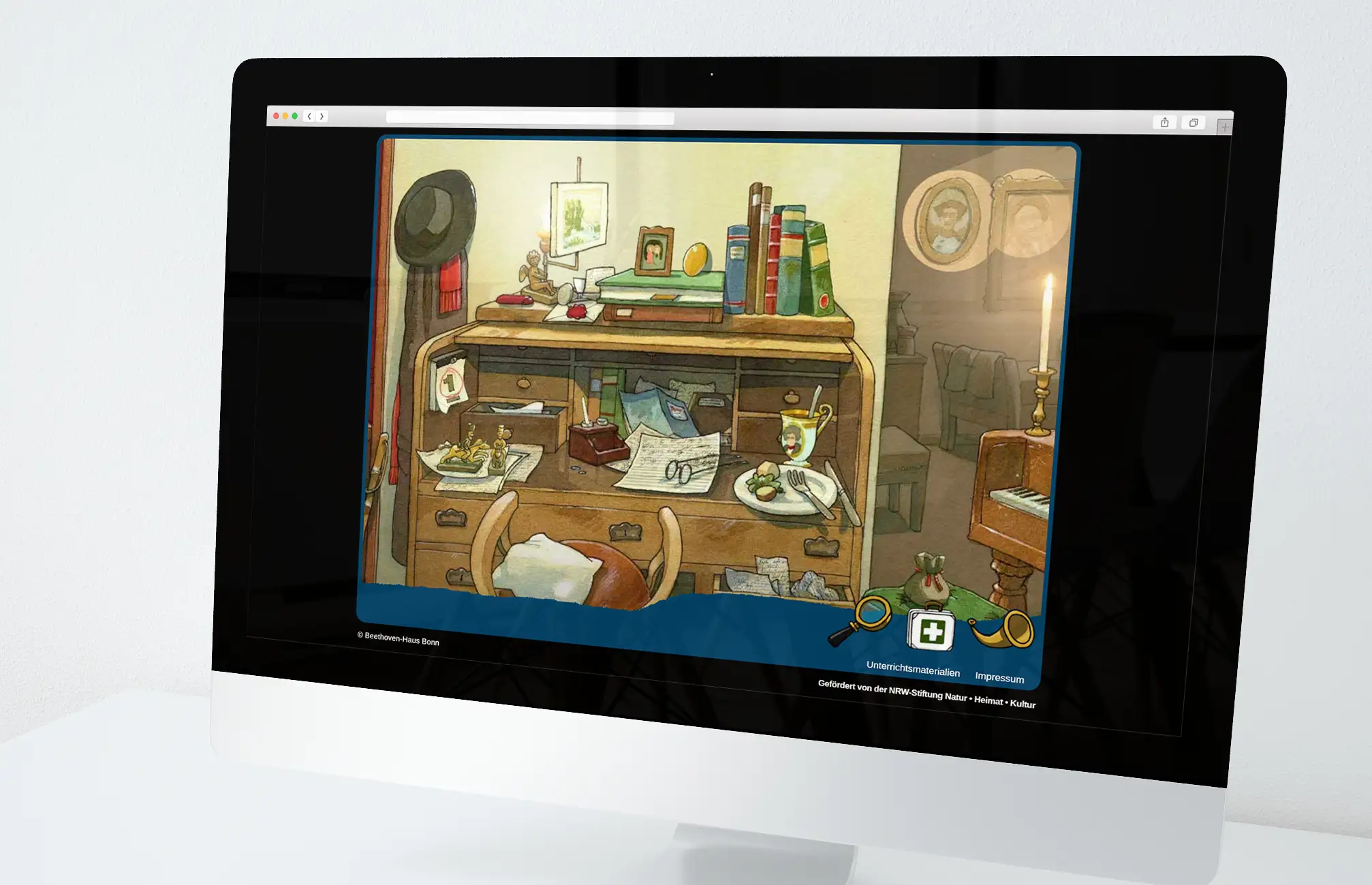 Die Seite "Hallo Beethoven" richtet sich vor allem an Kinder und ist daher sehr intuitiv und verspielt in Navigation und Interaktion umgesetzt worden. In Beethovens Arbeitszimmer, der eigentlichen Startseite, locken die animierten Gegenstände in die jeweiligen Kapiteln aus Beethovens Leben, wo sich vielerlei Infos, Spiele und interaktive Animationen verbergen.