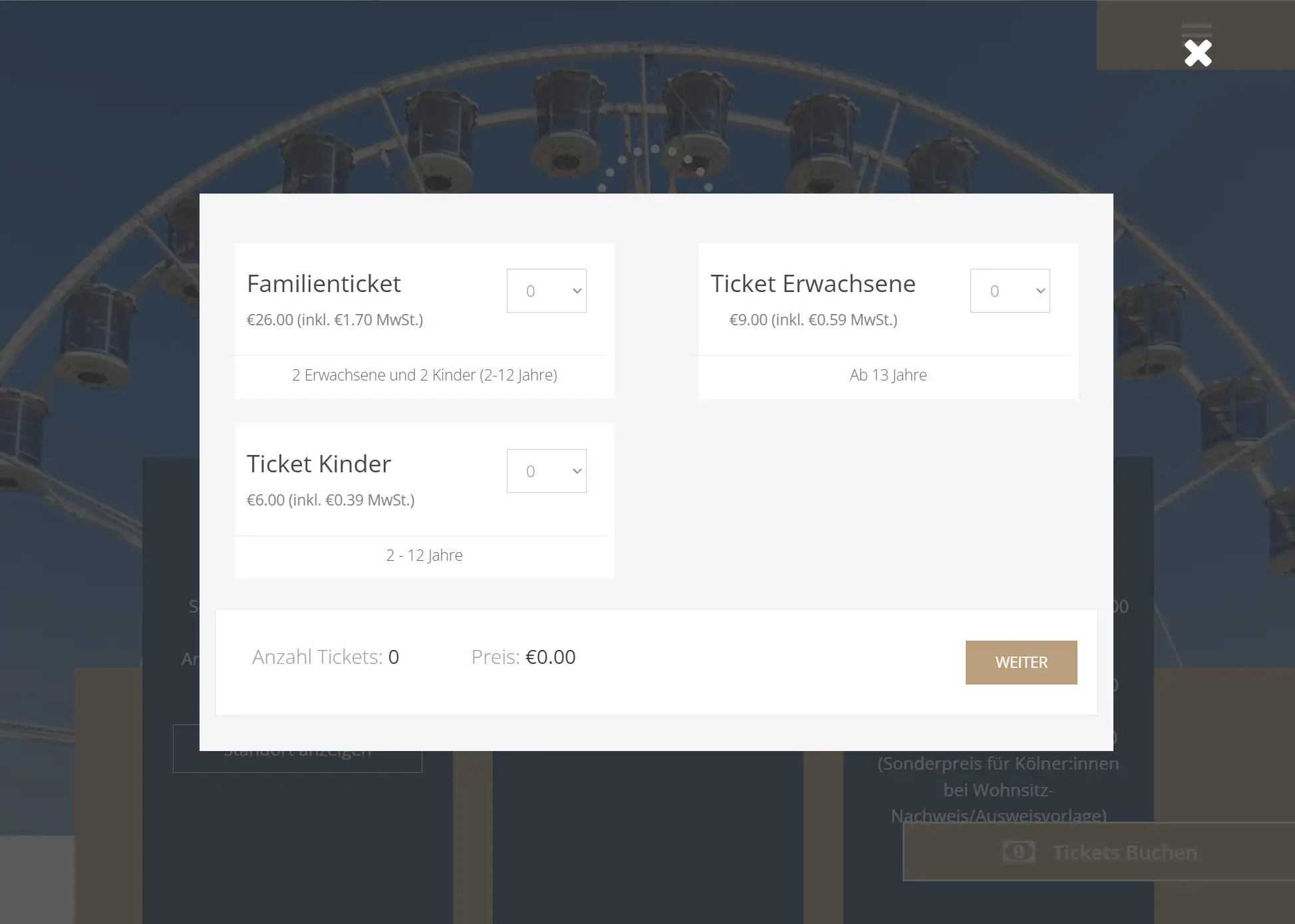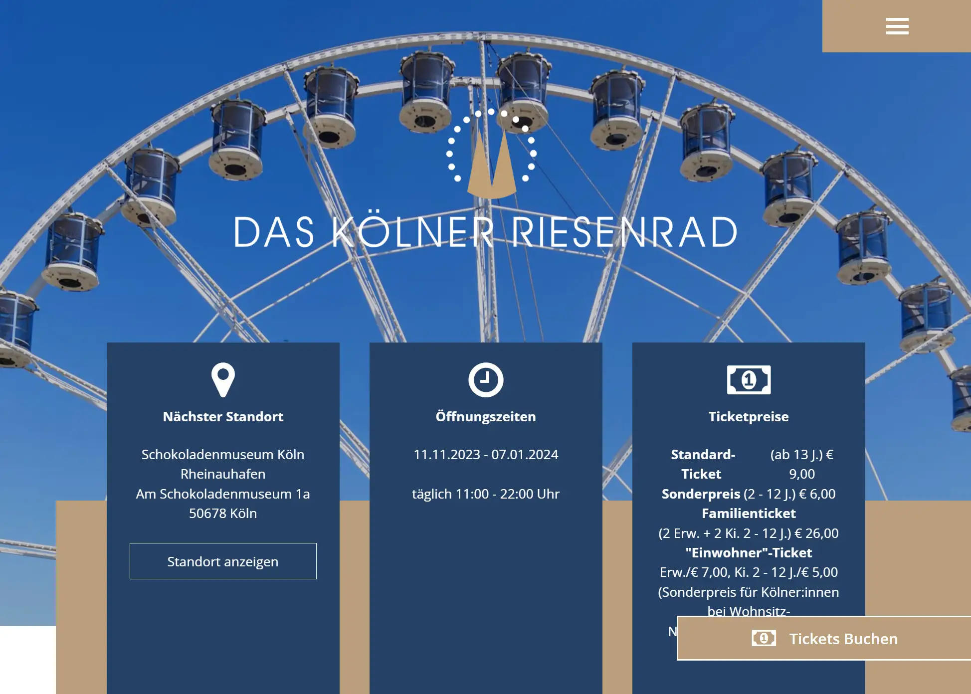 Für das Kölner Riesenrad haben wir zusätzlich ein Online-Ticket-System implementiert. Dies umfasst die Anbindung an PayPal für den Endnutzer sowie eine Exportfunktion für Drittanbieter wie GetYourGuide und Tiqets. Zusätzlich dazu haben wir eine mobile App für den Ticket-Check vor Ort entwickelt, mit der einzelne Tickets oder vollständige Bestellungen überprüft und entwertet werden können. Eine weitere nennenswerte Funktion im Ticket-Backend ist ein grafisches Interface zur Darstellung und Analyse der Ticket-Umsätze.
