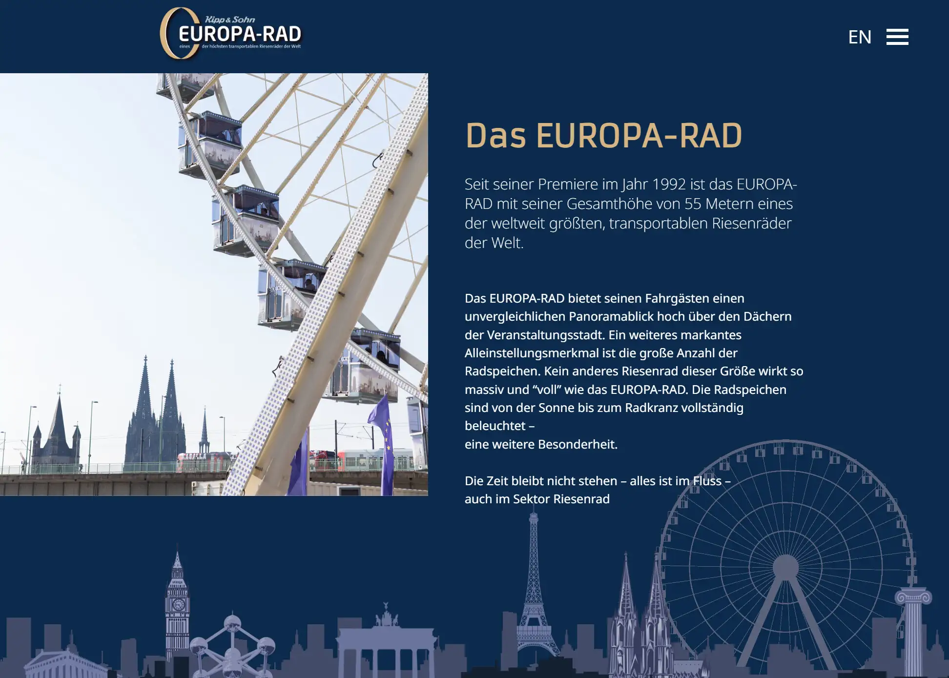 Für die Firma Kipp & Sohn haben wir die Seiten "Das Kölner Riesenrad" und "Europarad" in einer Typo3-Multidomain-Instanz umgesetzt. Bei beiden Seiten liegt das Hauptaugenmerk auf der eindrucksvollen Darstellung der Riesenräder. Hierfür haben wir jeweils ein individuelles Design entwickelt. Neben einer speziellen Gewichtung des Bild-Handlings – dazu gehören automatische Prozesse zur Erzeugung verschiedener Auflösungen beim Upload ins Typo3-Backend und die Anpassung der Bildausgabe an die Nutzergeräte – haben wir auch eine Integration von Video-Slidern und Galerien realisiert.